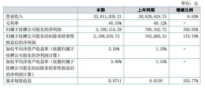 公司2018年上半年實現營業(yè)收入3281.10萬元,完成全年計劃的52.08%,較上年同期增長7.13%;實現利潤總額443.39萬元,完成全年計劃的55.42%,較上年同期增長313.31%;實現凈利潤319.81萬元,較上年同期增長356.65%,凈利潤的增長主要原因為,今年上半年營業(yè)收入增長營業(yè)成本下降,拓展了利潤空間,以及上年同期針對部分過期商品計提了減值準備導致上年同期利潤減少,截至報告期末公司基本每股收益為0.07元。?
