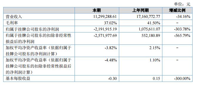 報(bào)告期內(nèi),公司營業(yè)收入11,299,288.61元,較上年同期的17,160,772.77元減少5,861,484.16元,降低34.16%;報(bào)告期內(nèi),公司凈利潤為-2,191,915.19元,較上年同期的1,075,611.07元減少3,267,526.26元。?