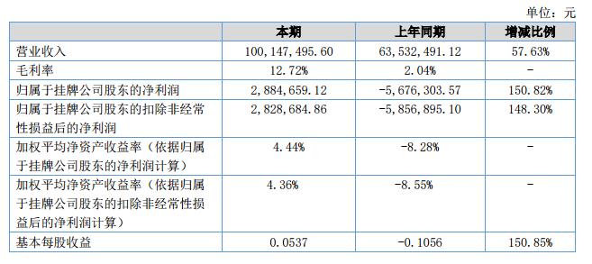 報告期內(nèi),公司實現(xiàn)營業(yè)收入100,147,495.60元,同比增長了57.63%,其中公司主要產(chǎn)品農(nóng)乳單體、聚醚單體、外加劑分別實現(xiàn)銷售收入18,325,672.97元、21,061,944.98元、8,803,853.12元,子公司室內(nèi)精裝、室外幕墻分別實現(xiàn)收入32,773,082.88元、4,140,824.67元。2018年上半年實現(xiàn)凈利潤2,884,659.12元。2017年1-6月凈利潤為-5,676,303.57元,同比增長8,560,962.69元,2018年1-6月毛利率為12.72%,而2017年1-6月毛利率為2.04%,較同期增長10.68個百分點。?