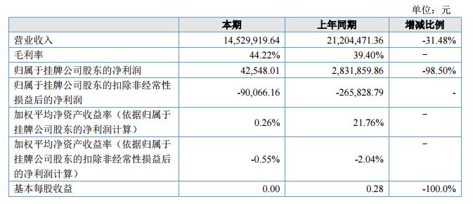 報告期內公司實現(xiàn)營業(yè)收入14,529,919.64元,較上年同期減少6,674,551.72元,降幅為31.48%,本期凈利潤42,548.01元,較上年同期減少2,789,311.85元,主要是營業(yè)收入減少本期毛利減少1,930,966.12元。