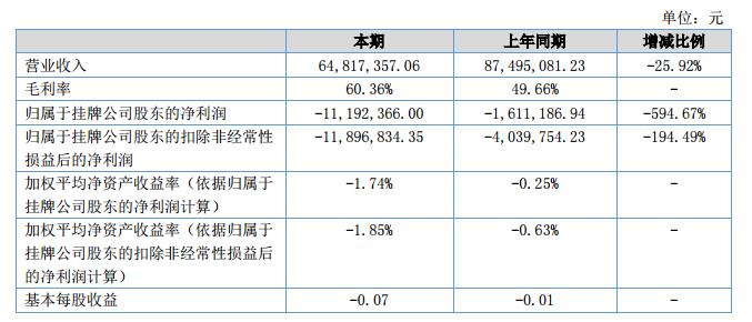 報(bào)告期內(nèi),公司實(shí)現(xiàn)營(yíng)業(yè)收入64,817,357.06元,上年同期實(shí)現(xiàn)營(yíng)業(yè)收入87,495,081.23元,同比下降25.92%;毛利率由上年同期49.66%上升至本期60.36%;歸屬于掛牌公司股東的凈利潤(rùn)-11,192,366.00元,上年同期歸屬于掛牌公司股東的凈利潤(rùn)為-1,611,186.94元,同比虧損增加594.67%。?