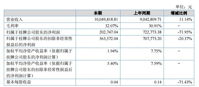 公司實(shí)現(xiàn)營(yíng)業(yè)收入1,004.98萬(wàn)元,較去年同期增長(zhǎng)11.14%;公司實(shí)現(xiàn)凈利潤(rùn)20.27萬(wàn)元,較去年同期減少71.95%。?