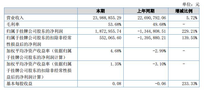2018年上半年實(shí)現(xiàn)銷(xiāo)售收入2,398.89萬(wàn)元,較上年同期增長(zhǎng)5.72%;利潤(rùn)總額305.58萬(wàn)元,較上年同期增長(zhǎng)683.46%;凈利潤(rùn)200.16萬(wàn)元,較上年同期增長(zhǎng)247.39%。?
