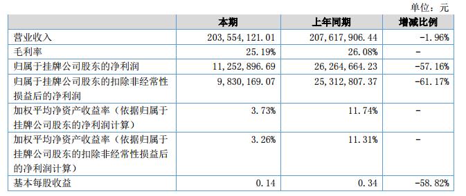 公司實現(xiàn)營業(yè)收入203,554,121.01元,同比下降1.96%;實現(xiàn)凈利潤11,252,846.71元,同比下降57.16%;扣除非經(jīng)常性損益后歸母公司的凈利潤為9,830,169.07元,同比下降61.17%。截至2018年6月30日,公司總資產(chǎn)786,268,771.90元,較上年末增長10.76%,凈資產(chǎn)369,679,429.97元,較上年末增長25.08%。?