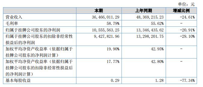 報告期內(nèi),公司營業(yè)收入3,646.60萬元,比上年同期相比下降24.61%,實現(xiàn)歸屬于掛牌公司股東的凈利潤1,055.55萬元,經(jīng)營活動產(chǎn)生的現(xiàn)金流量凈額1,302.58萬元。?