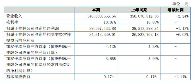 報(bào)告期內(nèi)公司實(shí)現(xiàn)營(yíng)業(yè)收入34,808.06萬(wàn)元,同比下降2.24%;營(yíng)業(yè)成本28,239.61萬(wàn)元,同比下降2.24%。實(shí)現(xiàn)歸屬于掛牌公司股東的凈利潤(rùn)3,906.74萬(wàn)元,同比下降1.13%;基本每股收益0.174,同比下降1.14%。