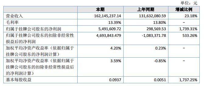 公司實現(xiàn)營業(yè)收入162,145,237.14元,比上年同期增加30,513,156.55元,增加23.18%;報告期內(nèi),營業(yè)成本140,432,971.44元,比上年同期增加26,961,297.74元,增加23.76%;公司實現(xiàn)凈利潤5,491,609.72元,比上年同期增加5,193,040.19元,增加1739.31%。?