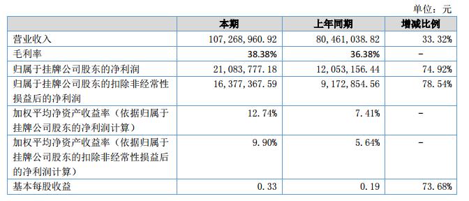 報告期內公司財務狀況良好,營業(yè)收入大幅增加,盈利能力明顯增強,現金流充足,資產負債率低。報告期內,公司實現營業(yè)收入10,726.90萬元,較上年同期增加2,680.80萬元,同比增長33.32%;實現凈利潤2,102.70萬元,較上年同期增加899.90萬元,同比增長74.82%。?