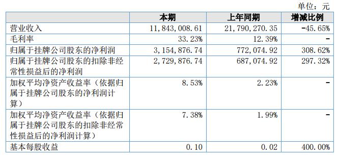 報告期內(nèi)公司實現(xiàn)營業(yè)收入11,843,008.61元,較上年同期減少9,947,261.74元,同比下降45.65%;報告期內(nèi)公司營業(yè)成本為7,907,233.20元,較上年同期減少12,114,268.31元,同比下降57.78%;報告期內(nèi)公司實現(xiàn)凈利潤3,154,876.74元,較上年同期增加2,382,801.82元,同比增長308.62%。?