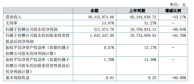 2018年上半年實(shí)現(xiàn)營(yíng)業(yè)收入4,841.59萬元,同比減少43.17%。公司2018年上半年?duì)I業(yè)成本為4,208.86萬元,同比減少28.11%。公司2018年上半年綜合毛利率為13.07%,較上年同期減少了18.21個(gè)百分點(diǎn)。公司實(shí)現(xiàn)凈利潤(rùn)21.16萬元,較上年同期減少1,058.75萬元。?