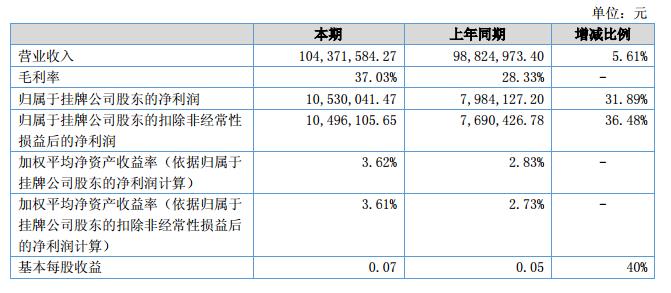 報(bào)告期內(nèi),公司實(shí)現(xiàn)營(yíng)業(yè)收入104,371,584.27元,較上年同期增加5,546,610.87元,增長(zhǎng)5.61%,報(bào)告期內(nèi),公司營(yíng)業(yè)成本65,720,489.40元,較上期減少5,111,131.04元,降低7.22%。?