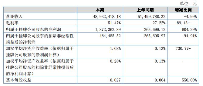 本報(bào)告期內(nèi),公司營(yíng)業(yè)收入48,932,418.18元,同比下降4.98%,營(yíng)業(yè)利潤(rùn)為1,107,814.47元,同比增加256.22%。?