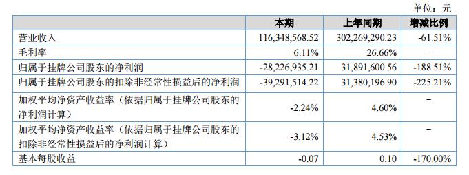 報告期末,我公司實(shí)現(xiàn)營業(yè)收入11,634.80萬元,同比下降61.51%;營業(yè)成本10,924.10萬元,同比下降50.72%;凈利潤-2,822.70萬元,同比下降188.51%;經(jīng)營活動產(chǎn)生的現(xiàn)金流量凈額-5,173.80萬元,同比下降1,326.67%。?