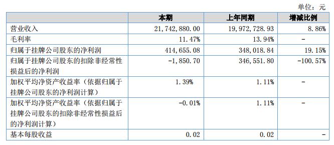 公司實(shí)現(xiàn)收入21,742,880.00元,同比增長8.86%。報(bào)告期內(nèi)公司營業(yè)成本19,248,783.87元,毛利率11.47%,上年同期毛利率13.94%。報(bào)告期內(nèi)歸屬于掛牌公司股東凈利潤414,655.08元,上年同期348,018.84元同比增長19.15%。?