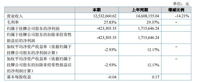 本期實現營業(yè)收入12,532,660.62元,較上年同期減少2,075,494.42元,減少了14.21%,公司營業(yè)成本9,044,729.65元,較上年同期減少1,273,038.44元,減少了12.34%。本期歸屬于掛牌公司股東的凈利潤為-423,305.35元,上年同期1,715,646.24元。