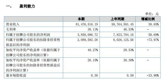 實現(xiàn)歸屬于母公司凈利潤 386 萬元,同比減少 397 萬元,減幅 50.69%。市場競爭比較大,材料上漲,用工成本增加,導(dǎo)致凈利潤下降。