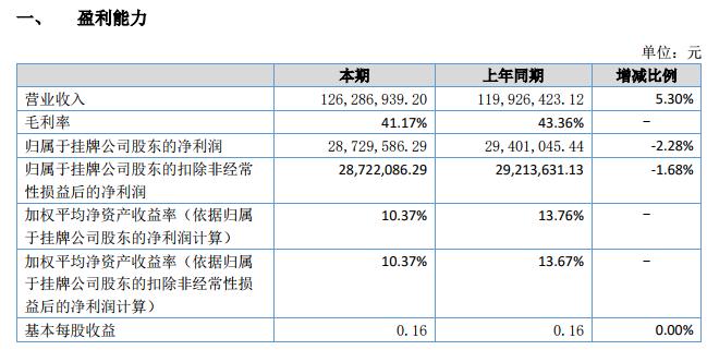 報(bào)告期內(nèi),公司實(shí)現(xiàn)收入 126,286,939.2,較去年同期 119,926,423.12 增長(zhǎng) 5.30%,實(shí)現(xiàn)凈利潤(rùn) 28,729,586.29,較去年同期 29,361,014.97 減少 2.15%;報(bào)告期毛利率 41.17%;公司總資產(chǎn)為 319,465,764.11,較年初 303,635,178.39 增長(zhǎng) 5.21%。