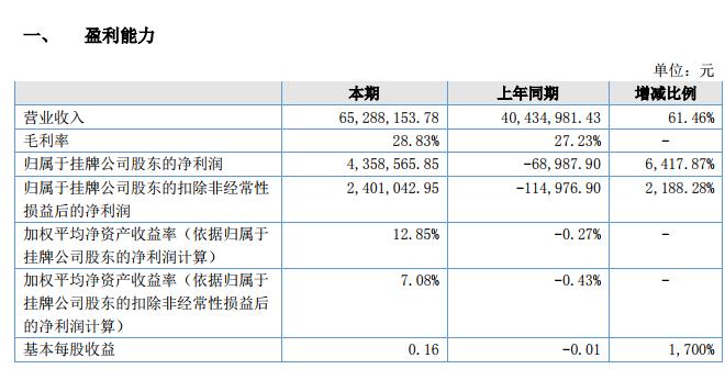 報(bào)告期內(nèi),公司資產(chǎn)總額 222,079,050.32 元,較年初增加 3,448,903.07 元,增幅 1.58%;本期負(fù)債總額為 185,967,897.89 元,較年初減少 909,622.78 元,減幅 0.49%;本期凈資產(chǎn)總額 36,111,152.43 元,較年初增加 4,358,565.85 元,增幅 13.73%;本期營業(yè)收入 65,288,153.78 元,較上年同期增加 24,853,172.35 元,增幅 61.46%;本期營業(yè)成本 46,467,082.87 元,較上年同期增加 17,041,153.98 元,增幅 57.91%,本期凈利潤 4,358,565.85 元,較上年同期增加 4,427,553.75 元,增幅 6,417.87%,本期經(jīng)營活動(dòng)產(chǎn)生的現(xiàn)金流量凈額 21,269,168.07 元,較上年同期增加 12,733,523.51 元,增幅 149.18%。
