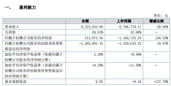 本報告期內(nèi),公司實現(xiàn)營業(yè)收入 8,215,944.86 元,較去年同期增長 20.88%;發(fā)生營業(yè)成本 4, 937,027.53 元,較上年同期增長 25.37%;毛利率 39.91%,較上年同期下降 2.15%,由于部分原材料物價上升、人員工資上漲及老產(chǎn)品售價下降等因素的共同影響下,毛利率略有下降。