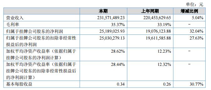 報告期內(nèi),公司實現(xiàn)營業(yè)收入231,571,489.23元,較去年同期增長5.04%;凈利潤25,189,025.93元,較去年同期增長32.04%;公司總資產(chǎn)期末為514,357,885.46元,較上年期末增長4.80%。?