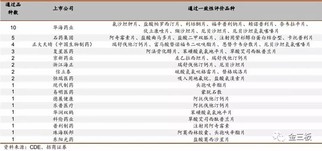 根據(jù)CDE和招商證券的統(tǒng)計(jì),目前通過一致性評價(jià)的品種涉及17個(gè)上市公司,其中A股14家,港股3家,新三板0家。