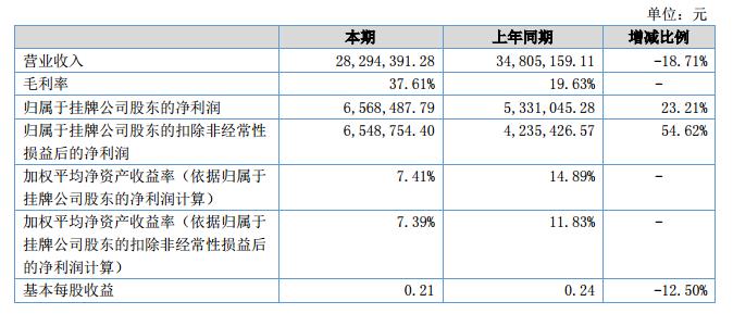 報(bào)告期內(nèi),公司實(shí)現(xiàn)營(yíng)業(yè)收入28,294,391.28元,較上年同期下降18.71%,營(yíng)業(yè)收入的下降主要是公司調(diào)整了產(chǎn)品結(jié)構(gòu),市場(chǎng)銷(xiāo)售主要以高附加值產(chǎn)品為主,同時(shí)取消了貿(mào)易板塊的銷(xiāo)售。公司實(shí)現(xiàn)凈利潤(rùn)6,568,487.79元,較上年同期增長(zhǎng)23.21%,凈利潤(rùn)的增加主要是產(chǎn)品銷(xiāo)售價(jià)格上調(diào),生產(chǎn)成本由于實(shí)施了技改呈下降趨勢(shì),期間費(fèi)用占銷(xiāo)售收入比重減少所致。?