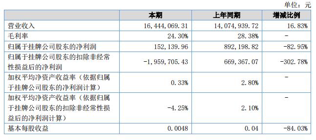 報告期內(nèi),公司實現(xiàn)營業(yè)收入16,444,069.31元,同比增長16.83%,實現(xiàn)凈利潤152,139.96元(扣除非經(jīng)常性損益后的凈利潤為-1,959,705.43元),凈利潤下降主要原因:1)毛利率下降:公司毛利率下降至24.30%,主要由于公司國外出口額下降,國內(nèi)銷售穩(wěn)步增長,但國內(nèi)銷售產(chǎn)品毛利率低于國外銷售毛利率,從而導(dǎo)致公司整體毛利率下降。2)費用上升:公司銷售費用同比上升108.69%,主要由于公司為擴展國內(nèi)市場,從2017年下半年開始增加銷售人員、增加廣告投入導(dǎo)致;研發(fā)費用同比上升142.67%,主要由于公司增加了“一種家用或小型商用變頻調(diào)速自動恒溫?zé)岜霉┡瘷C組”、“一種低環(huán)境溫度熱泵集中供暖系統(tǒng)”等項目的研發(fā)投入。?