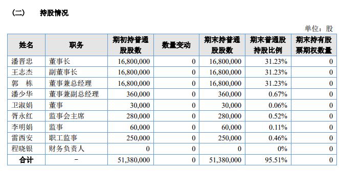 據(jù)挖貝網(wǎng)了解,2018年9月13日股東潘晉忠、郭棟、王志杰在全國(guó)中小企業(yè)股份轉(zhuǎn)讓系統(tǒng)通過(guò)盤(pán)后協(xié)議轉(zhuǎn)讓方式合計(jì)完成268.8萬(wàn)股的減持,權(quán)益變動(dòng)前潘晉忠、郭棟、王志杰合計(jì)持股90%,權(quán)益變動(dòng)后持股比例合計(jì)為85%。