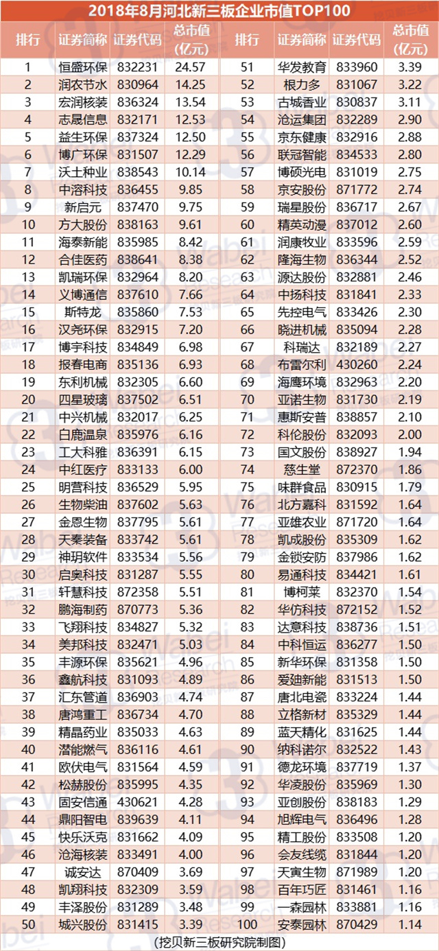 附:2018年8月河北新三板企業(yè)市值TOP100