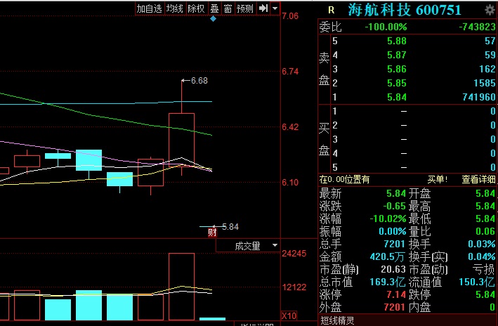 挖貝網 9月25日消息,今日,停牌超8個月的A股上市公司海航科技(600751)復牌,開盤即跌停。截至收盤,海航科技股價報收于5.84元,跌幅為10.02%,封單超74萬手。