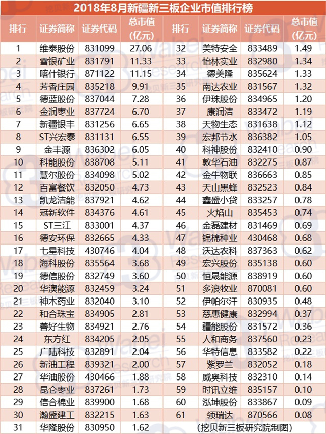 附:2018年8月新疆新三板企業(yè)市值排行榜