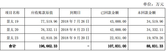 公告顯示,截至9月25日,華業(yè)資本應收賬款業(yè)務累計出現(xiàn)逾期未回款的金額為8.88億元,占公司2017年12月31日經審計凈資產的 13.06%。華業(yè)資本的應收賬款逾期未回款部分,全部來自于景太項目。
