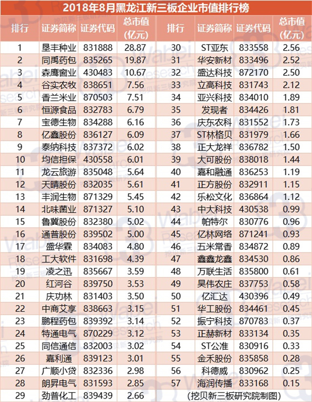 附:2018年8月黑龍江新三板企業(yè)市值排行榜