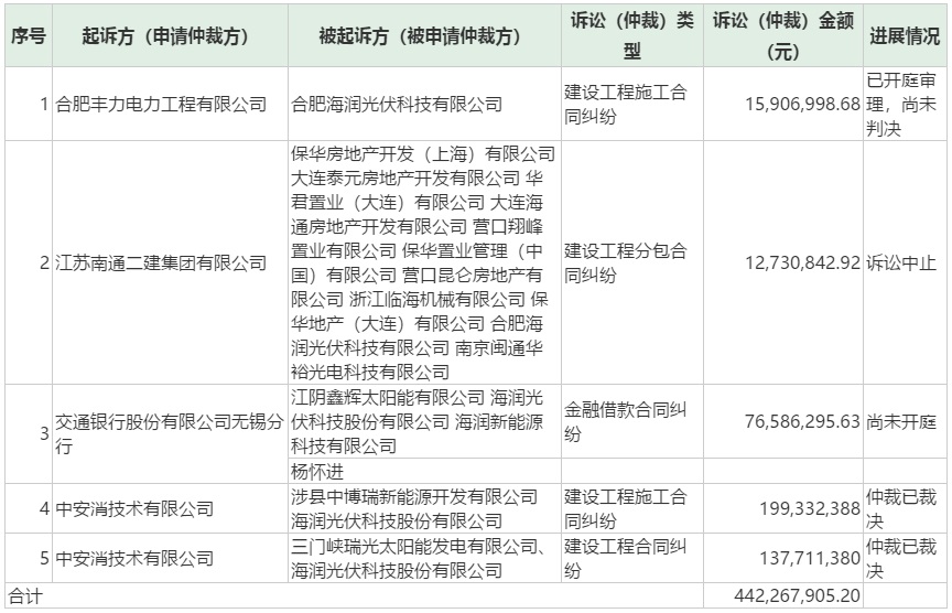 據(jù)ST海潤最新公告顯示,截至目前,公司均作為被告方,累計(jì)涉及5起重大訴訟,涉案金額4.96億元。其中,一起訴訟在開庭審理階段,一起訴訟中止,一起尚未開庭,兩起通過仲裁已裁決。