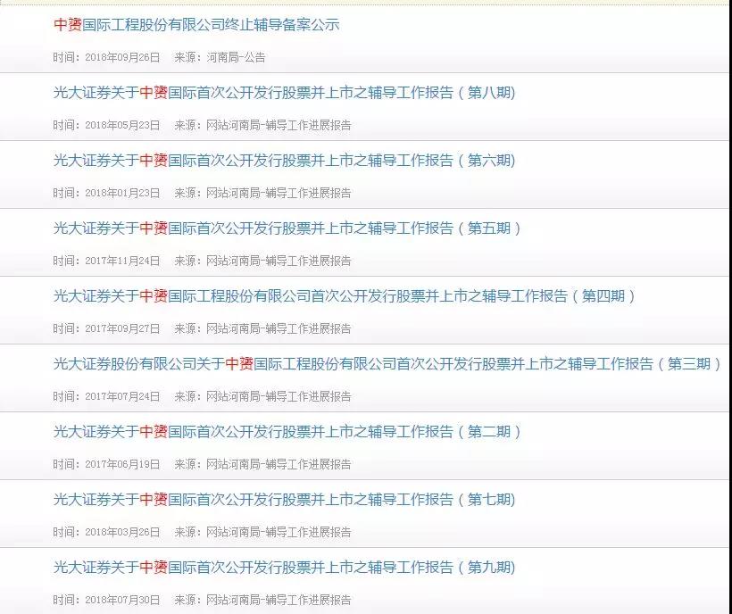 在輔導(dǎo)期間,河南證監(jiān)局官網(wǎng)先后公布了光大證券對中赟國際的9期輔導(dǎo)工作報告。其中第九期輔導(dǎo)時間為今年5月14日-7月16日。