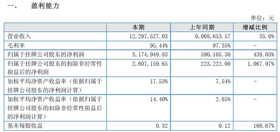 報(bào)告期末,公司總資產(chǎn)為2238.85 萬(wàn)元,較上年同期(2017.6.30)增加1064.01 萬(wàn)元;營(yíng)業(yè)收入達(dá)到1229.75 萬(wàn)元,較上年同期增長(zhǎng)322.89 萬(wàn)元;凈利潤(rùn)317.49 萬(wàn)元,較上年同期增加258.48 萬(wàn)元;經(jīng)營(yíng)活動(dòng)產(chǎn)生的現(xiàn)金流量?jī)纛~為-133.58 萬(wàn)元,較上年同期增加 -120.26 萬(wàn)元。