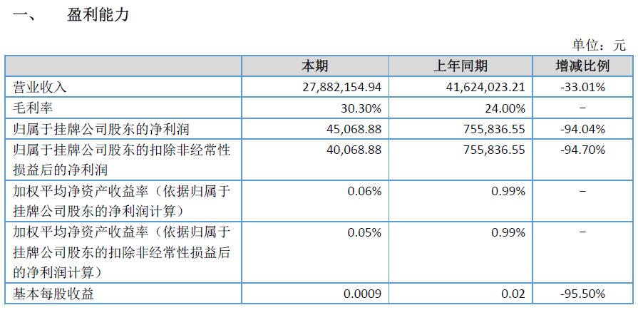報告期,公司實現(xiàn)營業(yè)收入為52,632,775.81 元,較上年同期減少28.69%,公司凈利潤為-3,322,893.37 元,較上年同期減了433.52%,主要原因是本期營業(yè)收入較上年同期減少了28.70%,且本期由于子公司人員工資調(diào)整,管理費用較上年同期增加了68.45%,加上本期公司財務費用較上年同期增加了62.94%,因此本期凈利潤較上年同期降幅較大??鄢墙?jīng)常性損益后的凈利潤為-3,316,844.69元,較上年同期減少616.36%。