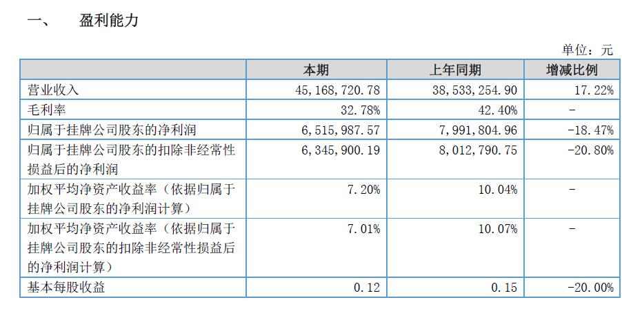 報告期內(nèi)實(shí)現(xiàn)營業(yè)收入45,168,720.78 元,同比增長17.22%,營業(yè)成本30,363,278.37 元,同比增長36.81%,凈利潤6,515,987.57 元,同比減少18.47%。