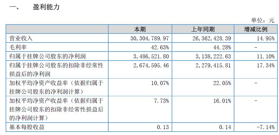 報告期內(nèi),公司總體經(jīng)營情況良好,營業(yè)收入和利潤均有較大幅度增長。2018 年1-6 月實現(xiàn)營業(yè)收入3030.48 萬元,較上年同期增長14.95%;實現(xiàn)利潤總額400.49 萬元,較上年同期增長8.67%;實現(xiàn)歸屬于掛牌公司股東的凈利潤 348.65 萬元,較上年同期增長11.10%。