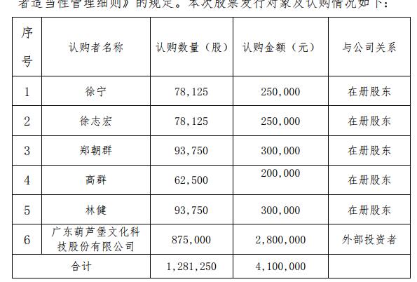 據(jù)介紹,喜之家計劃以3.2元/股價格向董事長徐寧、董事徐志宏、董事鄭朝群、在冊股東林健、在冊股東高群以及廣東葫蘆堡文化科技股份有限公司發(fā)行不超過 128.125 萬股,計劃募資410 萬元。