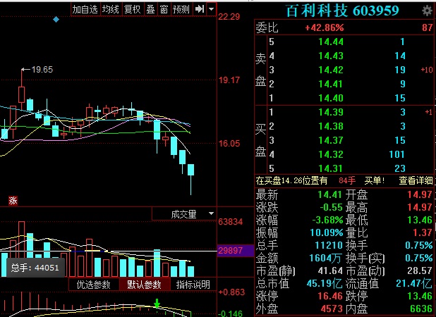 今日,百利科技股價小幅高開后,便在低于昨收盤價下方震蕩,盤中曾觸及跌停。截至發(fā)稿,百利科技股價報收于14.41元,總成交量為1.12萬手,總成交額為1604萬元。