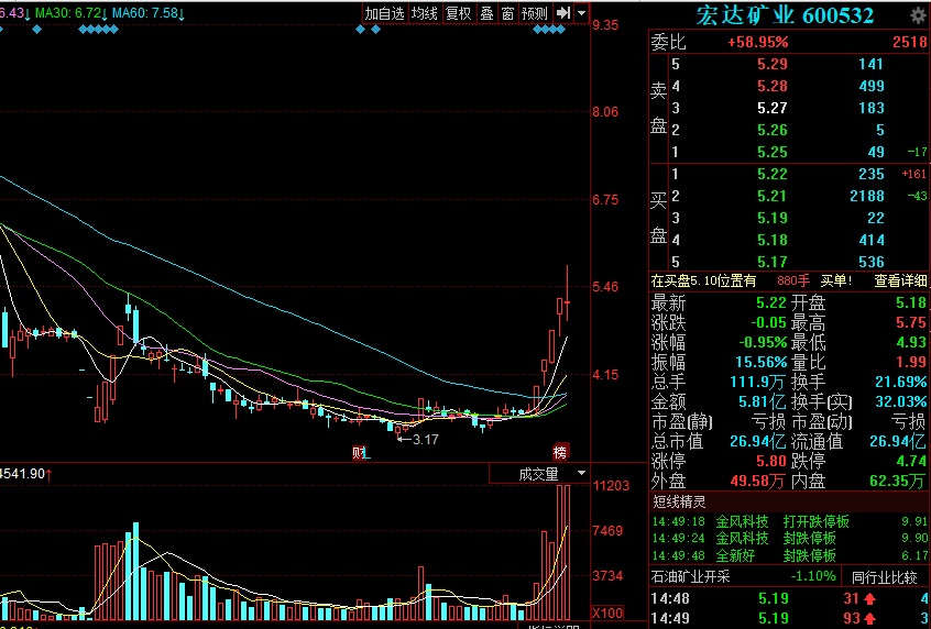 9月27日至10月9日,宏達(dá)礦業(yè)在4個交易日中連收漲停,并且成交量明顯放大。宏達(dá)礦業(yè)近日股價變動屬異常波動,公司表示,不存在任何應(yīng)披露而未披露的影響股價的重大信息,如資產(chǎn)重組、發(fā)行股份、資產(chǎn)注入等。今日,宏達(dá)礦業(yè)股票沖高后回落,截至發(fā)稿,股價為5.22元,成交量已與昨日全天成交量持平。