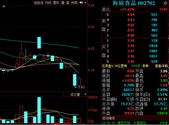 今日,海欣食品股價上漲,截至收盤,股價為4元/股,上漲了3.63%。