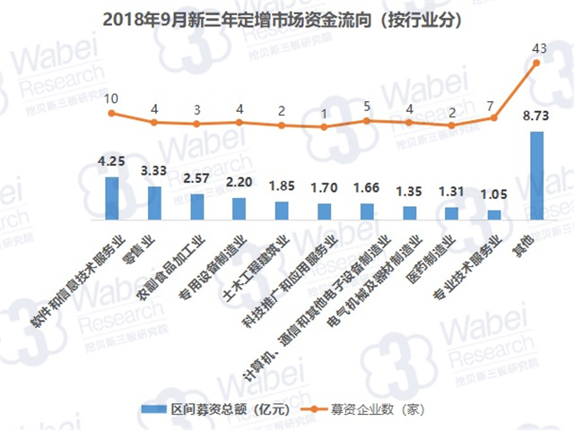 上月,新三板定增市場(chǎng)上,吸引資金最多的行業(yè)是軟件和信息技術(shù)服務(wù)業(yè),共募資4.25億元;其次是零售業(yè),募資3.33億元。