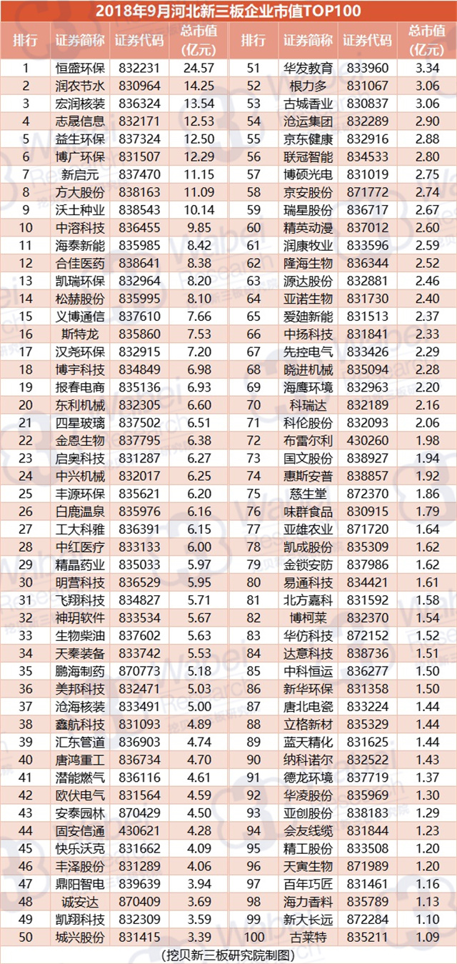 附:2018年9月河北新三板企業(yè)市值TOP100