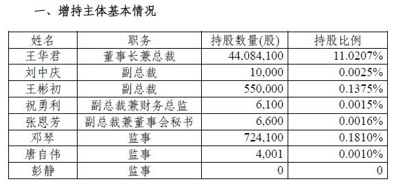 公告稱,董事長兼總裁王華君、副總裁劉中慶、副總裁王彬初、副總裁兼財務(wù)總監(jiān)祝勇利、副總裁兼董事會秘書張恩芳、監(jiān)事鄧琴、監(jiān)事唐自偉、監(jiān)事彭靜將增持,其中王華君增持金額不低于1000萬不高于3000萬,其他高管增持金額都不低于50萬。