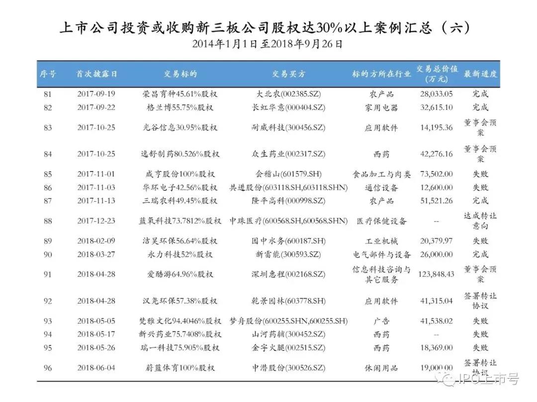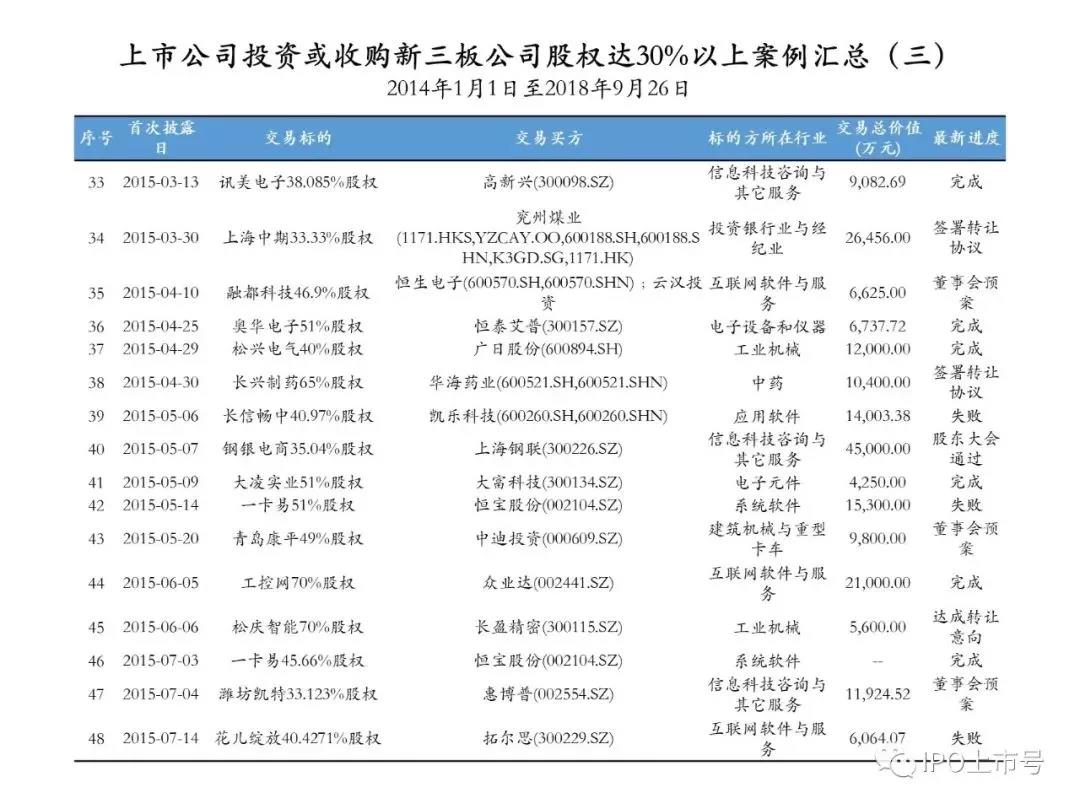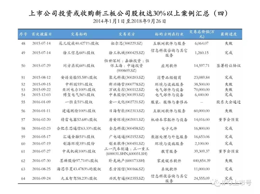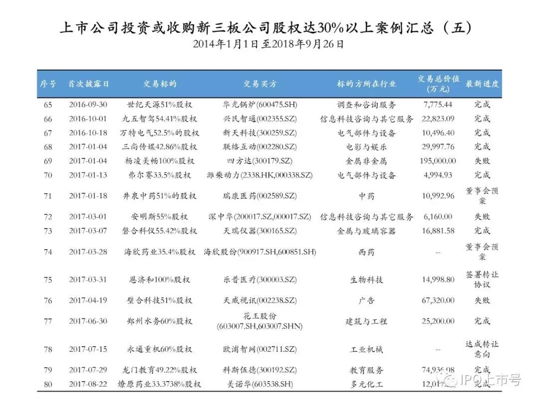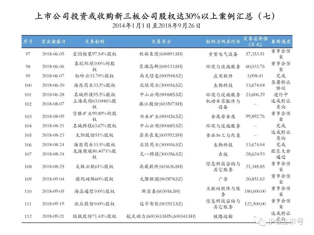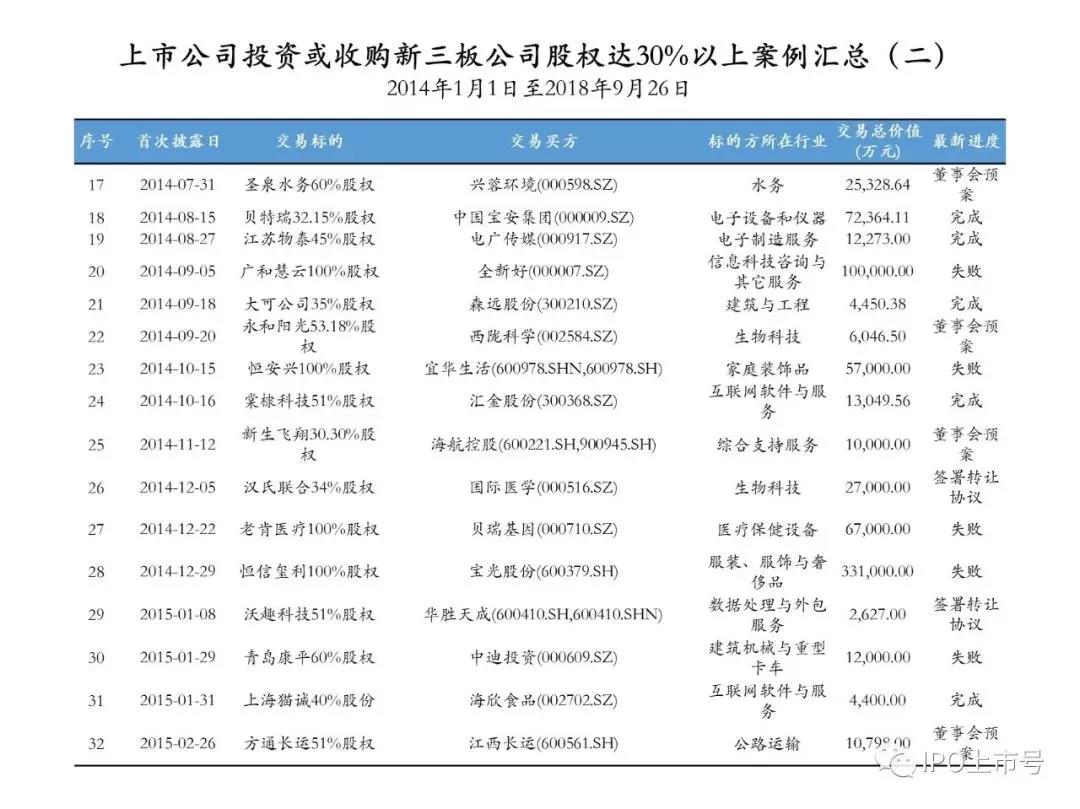 后續(xù)的表格中列舉的是自2014年1月1日至2018年9月26日上市公司投資或收購新三板企業(yè)股權(quán)達(dá)30%以上的案例,但是由于收集手段、收集途徑和精力的問題,可能存在掛一漏萬、錯漏百出的情形,還請各位讀者自行甄別,如下的案例僅供參考: