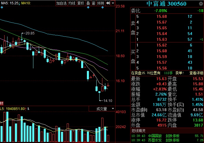 今日,中富通股票高開并保持高位震蕩,截至發(fā)稿,股價為15.63元/股,漲2.83%。