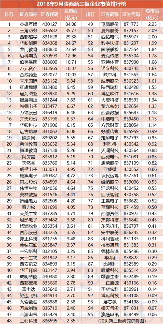 附:2018年9月陜西新三板企業(yè)市值排行榜