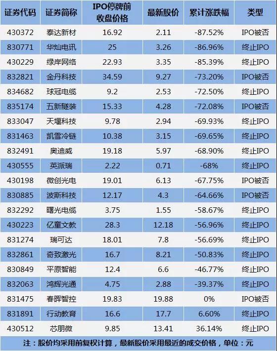 出去摘牌以及無成交的公司,剩下的公司中,那些曾經采用過做市轉讓、股東人數(shù)較多的,在IPO失敗后復牌時大多都出現(xiàn)了暴跌。下跌50%基本屬于“正常水平”,多的跌幅會超過70%甚至80%。